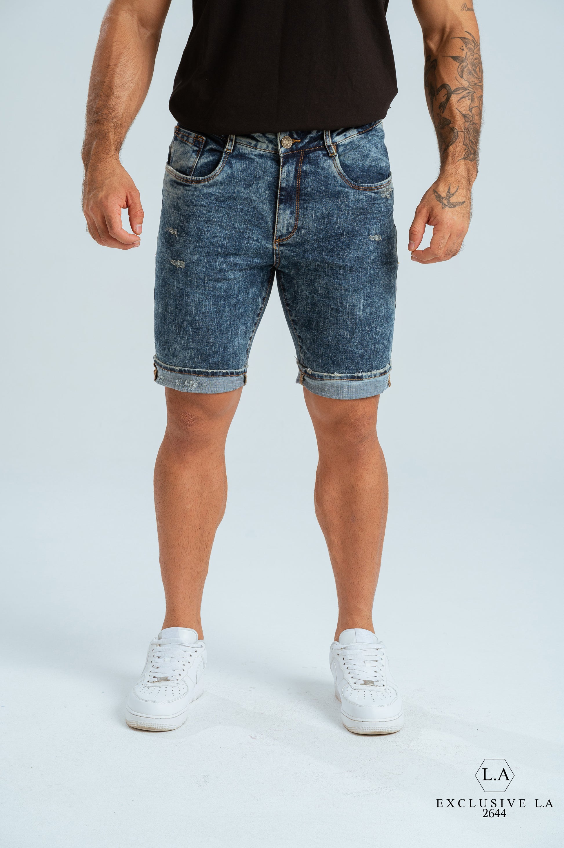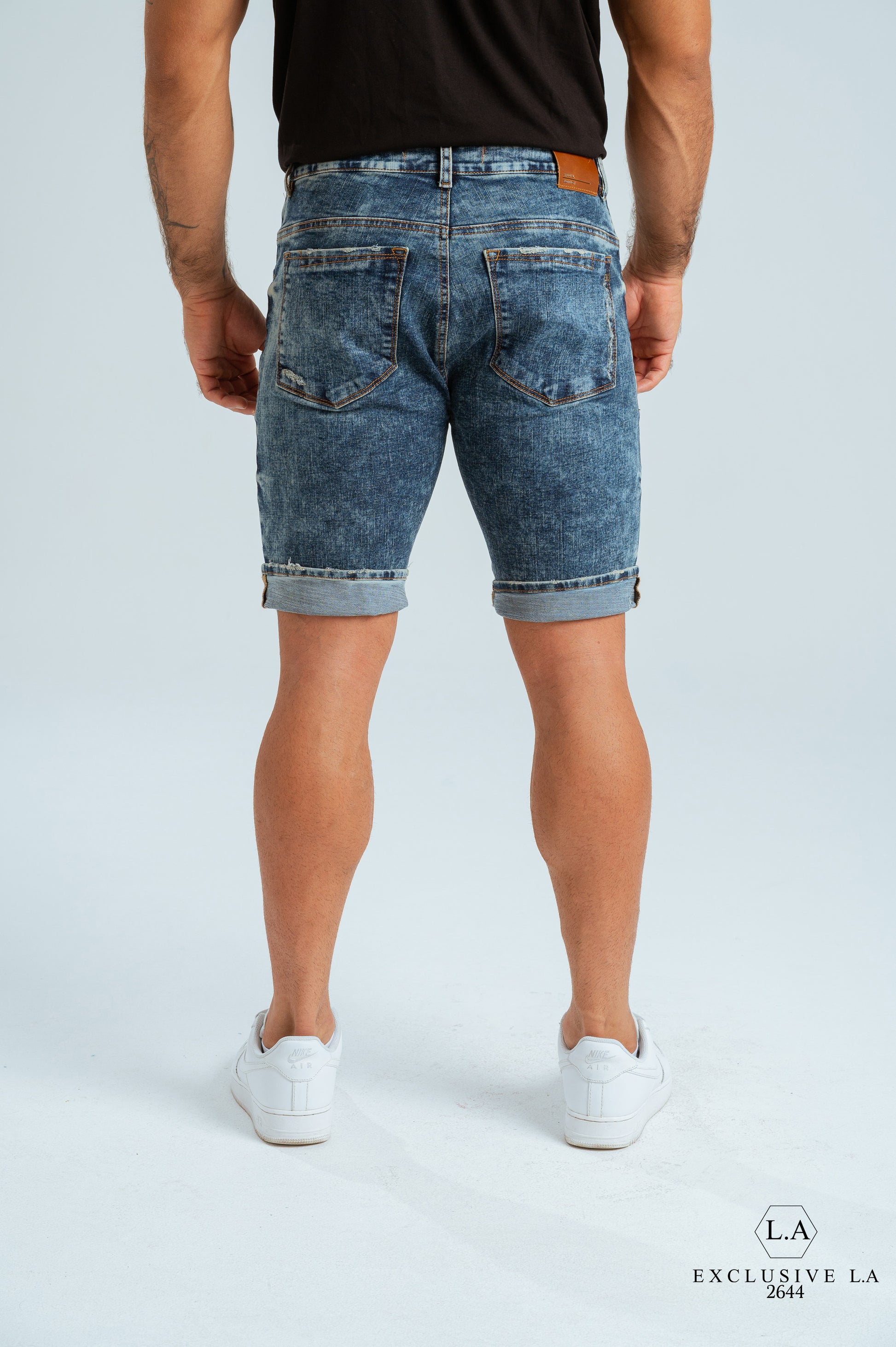 Bermuda, tela strech, Horma normal, tono azul medio, diseño cinco bolsillos. Materiales: 98% algodón y un 2% de elastano.