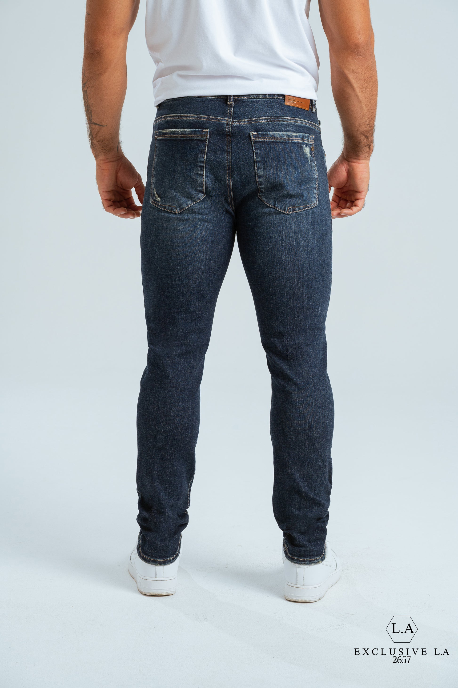 Jean Slim, tela strech, Horma normal, tono azul oscuro, diseño cinco bolsillos. Materiales: 98% algodón y un 2% de elastano.